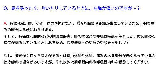 Q.息を吸ったり、歩いたりしているときに、左胸が痛いのですが…? 2020.12.12 循環器科 Tweet Share Hatena Pocket RSS feedly Pin it この記事のタイトルとURLをコピーする