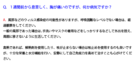 Q.1週間前から息苦しく、胸が痛いのですが、何か病気ですか? 2020.12.16 循環器科 Tweet Share Hatena Pocket RSS feedly Pin it この記事のタイトルとURLをコピーする