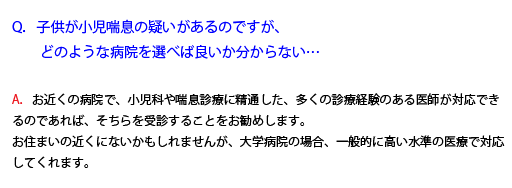 Q.子供が小児喘息の疑いがあるのですが、どのような病院を選べば良いか分からない… 2020.12.15 小児科 Tweet Share Hatena Pocket RSS feedly Pin it この記事のタイトルとURLをコピーする