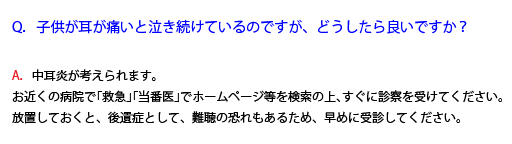 Q.子供が耳が痛いと泣き続けているのですが、どうしたら良いですか? 2020.12.19 小児科 Tweet Share Hatena Pocket RSS feedly Pin it この記事のタイトルとURLをコピーする