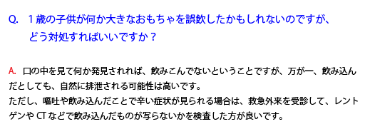 Q.1歳の子供が何か大きなおもちゃを誤飲したかもしれないのですが、どう対処すればいいですか? 2020.12.18 小児科 Tweet Share Hatena Pocket RSS feedly Pin it この記事のタイトルとURLをコピーする